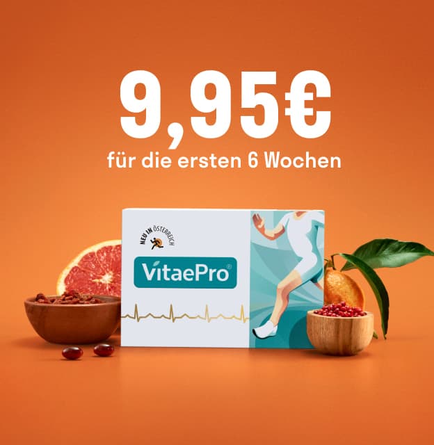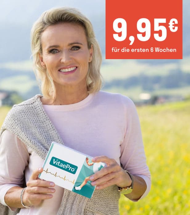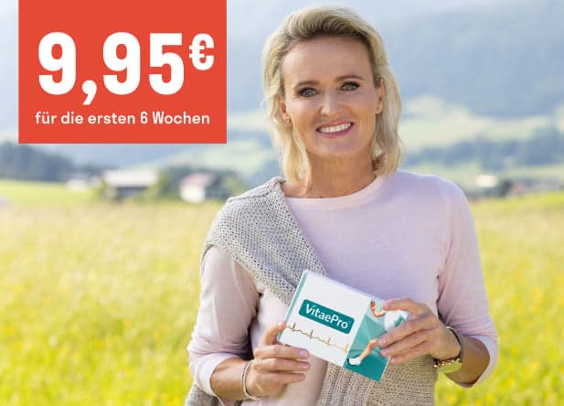 Wenn Sie VitaePro heute bestellen, können Sie die erste Packung VitaePro zum einmaligen Kennenlernpreis von nur 9,95 € testen. Der Inhalt reicht für 6 Wochen.